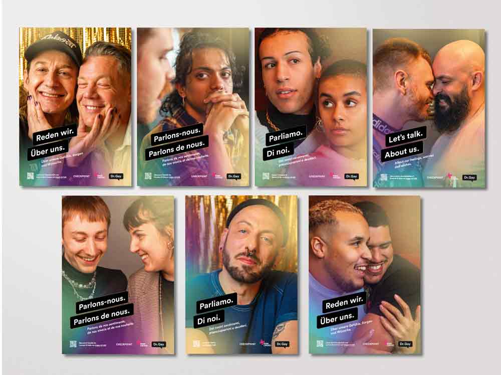 Das Set aus sieben Plakaten thematisiert Freundschaften in schwulen und queeren Kontexten zur Stärkung der psychischen Gesundheit.