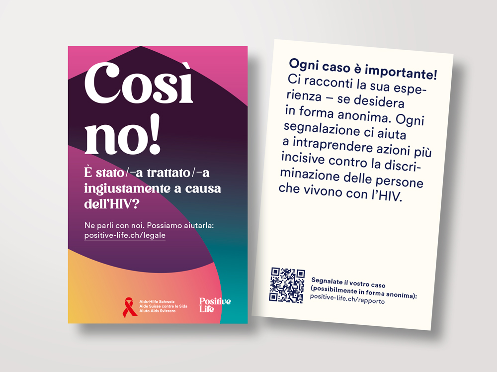 Mini volantino per pubblicizzare il supporto legale per le persone con HIV e il centro di segnalazione delle discriminazioni da HIV